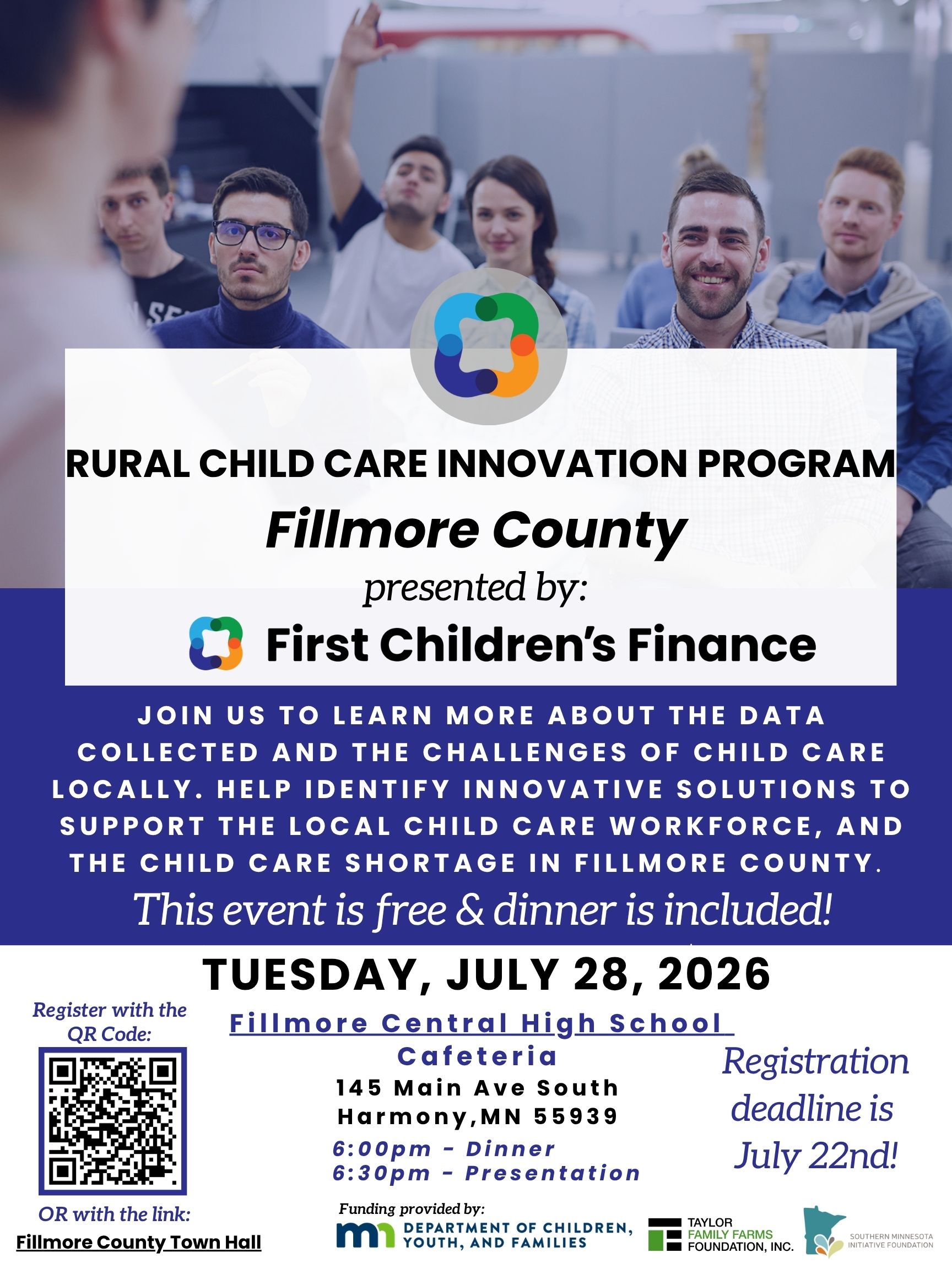 Fillmore County has partnered with First Children’s Finance to develop community-based solutions to local child care needs. You can help by opening the Survey Links form below and registering for the Town Hall scheduled for July 28, 2026.