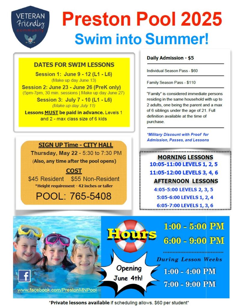 Preston offers a summer recreation program for youth that includes swimming lessons, baseball, softball and tee ball. Contact City Hall at 507-765-2153 for details on Swimming Lessons. Contact Fillmore Central Schools for details on summer recreation activities at 507-765-3809